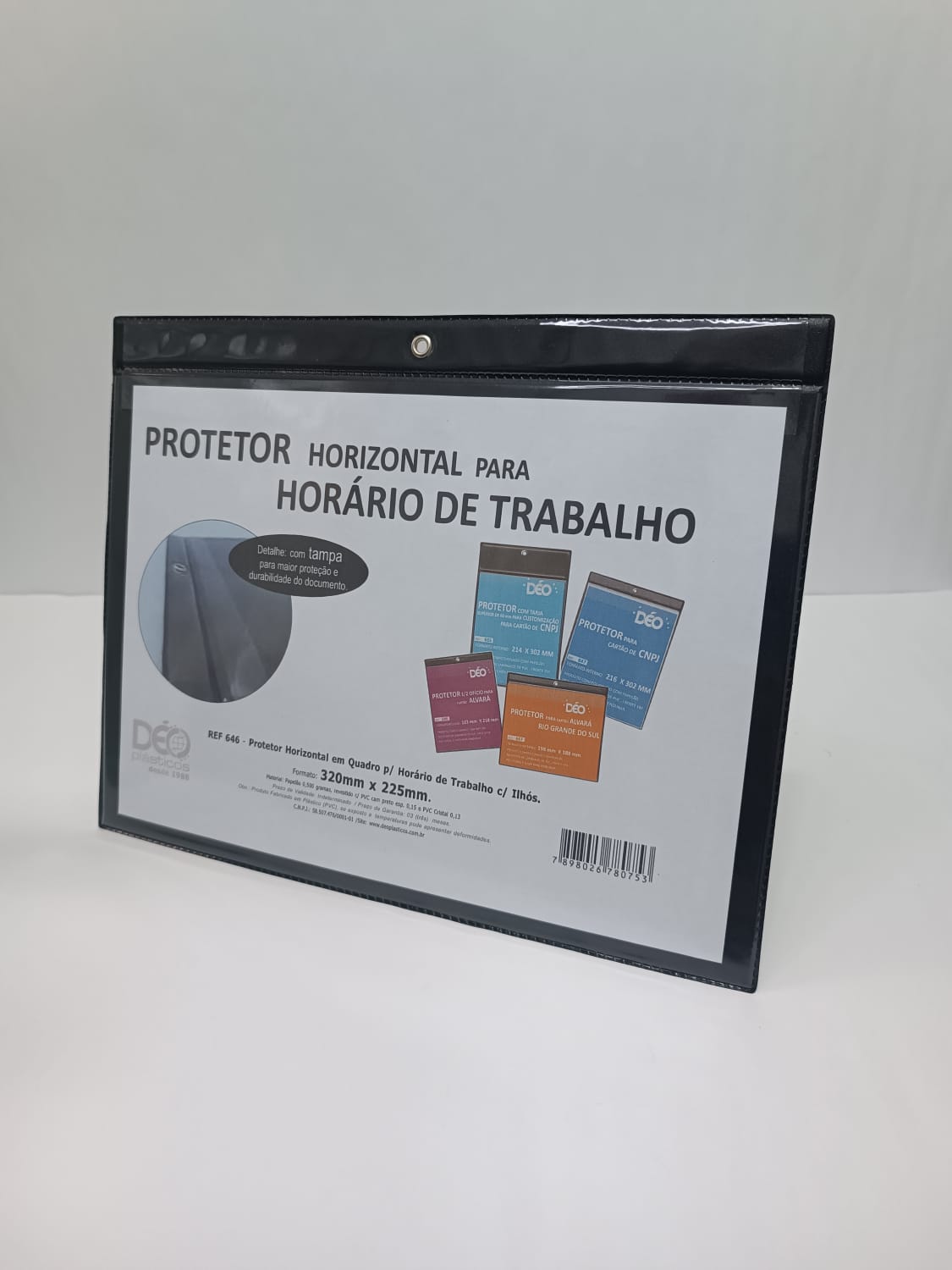 Ref 646PTO _ PORTA DOCUMENTO EXPOSITOR EM QUADRO HORIZONTAL para HORÁRIO DE TRABALHO – FORMATO INTERNO 320X225MM – Tampa com 20 mm Mantenha seus documentos seguros e organizados com a mais alta proteção! Temos o produto ideal para garantir a integridade dos seus documentos mais importantes, sejam eles certificados, contratos, diplomas, alvarás ou qualquer material que precise de proteção duradoura. Nosso Protetor de Documentos em Quadro de PVC, a solução perfeita para armazenar, exibir e preservar seus papéis! O que torna nosso Protetor de Documentos Único? ?? Tampa Protetora: Ao contrário dos modelos tradicionais, nosso protetor possui tampa que garante a proteção total contra poeira, sujeira, umidade e danos físicos, evitando que seus documentos se desgastem ou desbotem com o tempo. ?? Durabilidade e Resistência: Fabricado em PVC de alta qualidade, nosso protetor é resistente e durável, oferecendo uma proteção extra contra rasgos e quebras. Ideal para ambientes comerciais, educacionais ou corporativos. ?? Fácil de Pendurar: Com um design pensado para facilitar o uso, nosso protetor de documentos vem pronto para ser pendurado na parede, palltes, máquinas, tornando a visualização e o acesso aos documentos práticos e rápidos. Marca Déo Plásticos | Fabricado no Brasil 0,096 kg